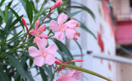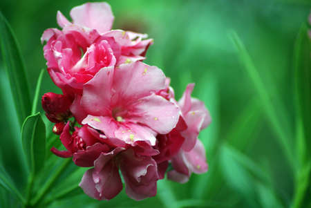 Blooming oleander. Pink blooming. Delicate oleander flowers close up