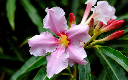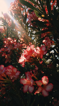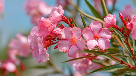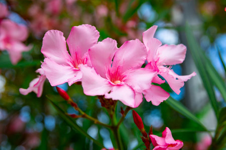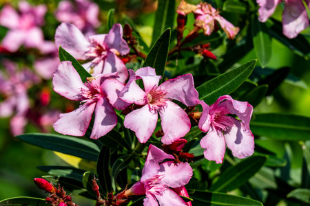 Beautiful close-up of pink oleander flowers in full bloom. The vibrant blossoms are surrounded by green foliage, creating a vivid contrast that highlights the flowers delicate petals.