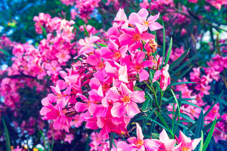 Close up view pink oleander or Nerium flowers blossoming on tree. Beautiful colorful floral background