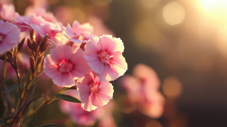 Close-up of pink flowers with delicate petals, basking in warm, golden sunlight. The background is softly blurred, enhancing the flowers vibrant hues.