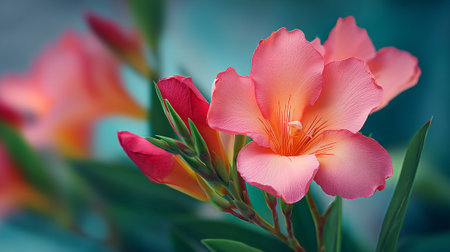 Beautiful Pink Oleander Blossom with Buds on Teal Background
