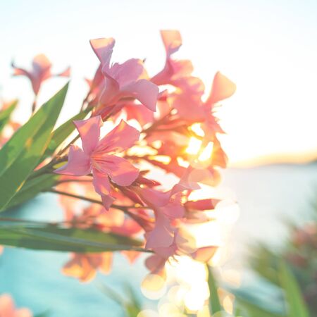 Flowering Oleander with little pink flowers against the sunrise clear sky. Macro image.