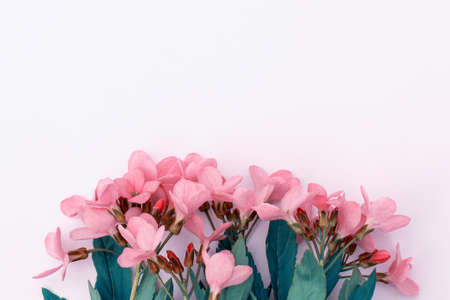 Closeup of pink flower and green leaf under sunlight with copy space using as background natural plants landscape, ecology wallpaper concept.