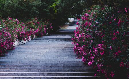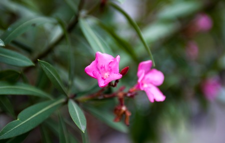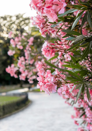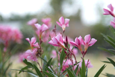 Blurred pink oleander flowers on a summer street. Selective focus. Place for text.