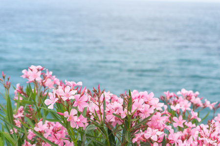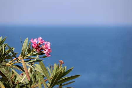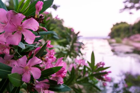 Nerium flowers on a background of turquoise water. Southern flowers on a shrub near the lake
