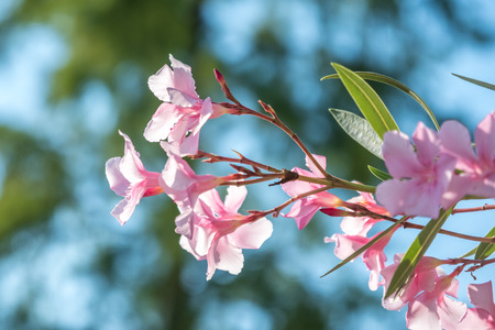 Nerium oleander flowers, sky on the background. Romantic and beautiful plant.