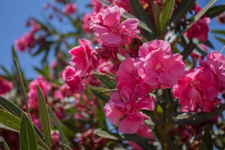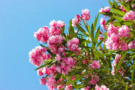 Pink blooming flowers of oleander tree against a blue sky. Nerium oleander in full bloom - an evergreen perennial poisonous plant in summer day in arboretum, botanical garden, park. floral postcard.