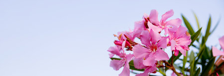 Close-up shot of oleander flower bush blooms in a park.Shrub, a small tree, cornel Apocynaceae family, garden plant. Pink summer oleander background.web banner