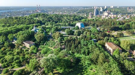 Aerial top view of Kiev city from above, Kyiv skyline and Dnieper river cityscape in spring, Ukraine