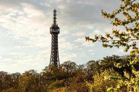 Prague, Czech Republic - May 3 2021: View of the Petrin lookout tower from 1891 standing on a hill surrounded with trees. Spring morning with blue sky and clouds.