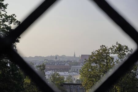 view of old town through a square hole in the fence of netting. Old building and a large number of tall trees against a light sky