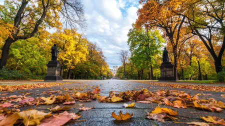 Discover a serene pathway adorned with vibrant autumn leaves and statues, set in a tranquil park. This scenic landscape captures the beauty of nature during fall, offering a peaceful escape.