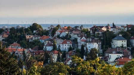 Old town of Bratislava in the evening with a lot of windmills on the horizon