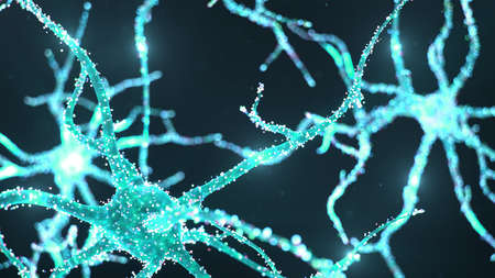 Abstract neural cells with luminous dots. Synapses and neuronal cells send electrical chemical signals. Neuron of interconnected neurons with electrical impulses. Transmit information, 3d illustration