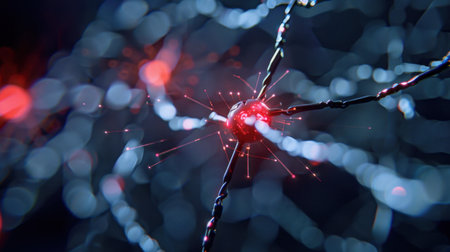 A detailed depiction of neuron activity showcases the complex web of connections within the nervous system. The bright synapses highlight the importance of communication between cells.