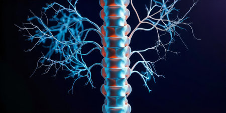 A detailed representation of the human spine showcases vertebrae surrounded by intricate neural pathways.