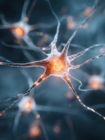 This stunning image captures a detailed neuron featuring glowing synapses amidst a dark abstract background, illustrating the complexity of neural connections and brain activity.
