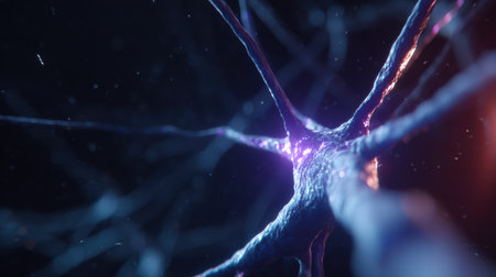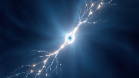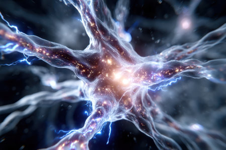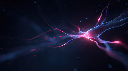 This abstract digital illustration features a glowing neuron and its synapses, capturing the intricate connections and interactions within the human brain.