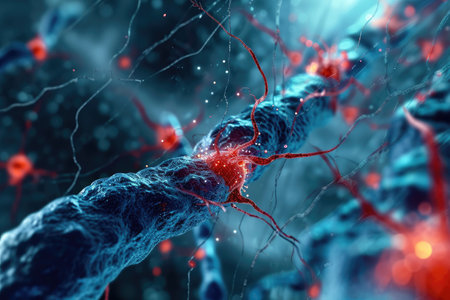Glowing web of blood vessels like electric wires branching across a textured dark red biological background. Generative AI