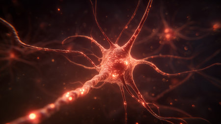 Neuron cell displaying an intricate network of dendrites and an axon, actively transmitting electrical impulses and signals as a fundamental unit of the human brain and nervous system