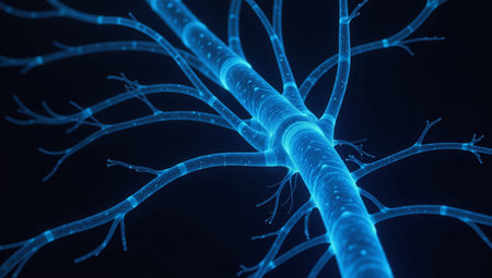 Detailed illustration of neurons with glowing synapses against a blue background, showcasing the intricate connections and electric activity within a vibrant digital world.