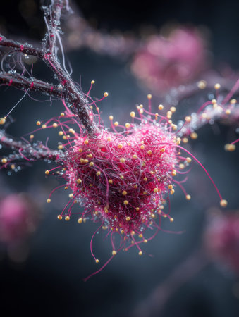 Detailed perspective of blood vessels filled with bright red cells on a twisted, dark background. The intricate network highlights the beauty of biological structures.