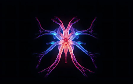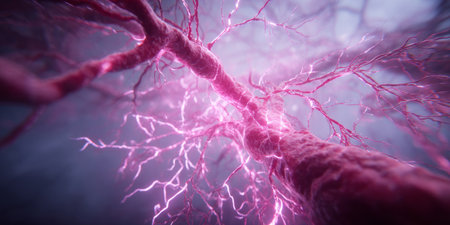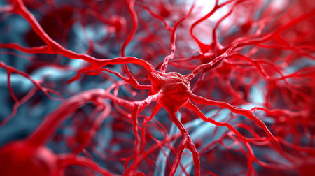 Glowing web of blood vessels like electric wires branching across a textured dark red biological background. Generative AI