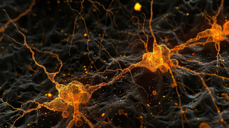 An artistic representation showcases a neuron cell. It displays an intricate network of radiating tendrils with vibrant orange hues against a dark background. The lighting highlights the cell's form. This image is suitable for various commercial uses, including science, medical publications, and educational materials.