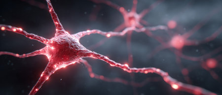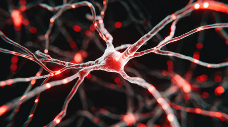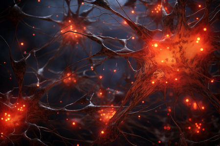 Glowing red neural cells in abstract brain network. Generative AI