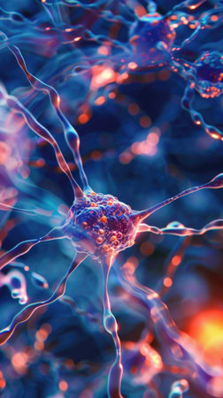 This vibrant digital artwork showcases a detailed visualization of neurons and synapses, emphasizing neural connections and activity. Ideal for scientific or educational purposes, it highlights the beauty of biological systems.