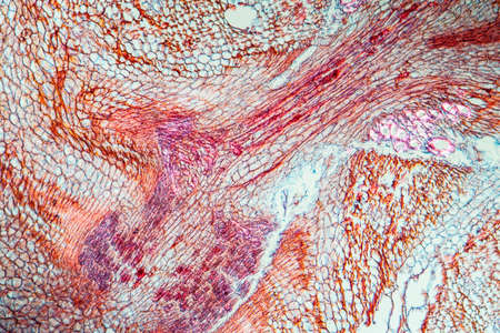 Microscopic view of stained carrot root cells. Cross section. Optical compound microscope. Brightfield. Objective 40x.