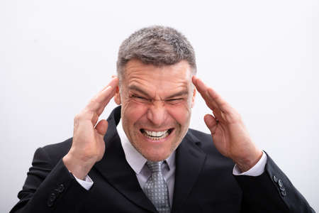 Portrait Of Mature Businessman Suffering From Headache Against White Background