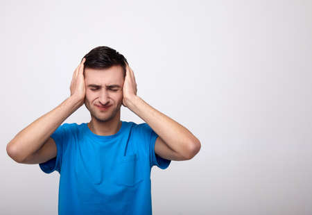 Portrait of a man with a headache on a white background.