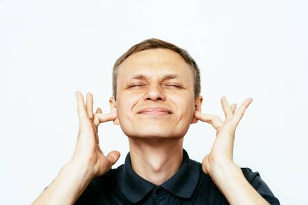 A mature man in a state of psychological stress in front of a light wall. A male with a short haircut and graying hair covers his ears with his hands. People, Human Emotions