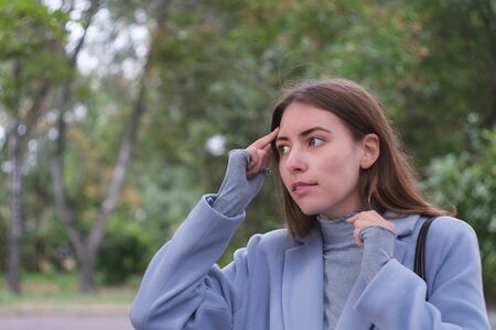 Forgetful woman touching her head having.