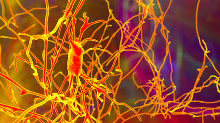 Neurons, brain cells, located in the pons Varolii of the human brain, 3D illustration