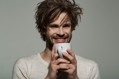 happy man with cup of tea or coffee has uncombed hair in underwear on grey background, morning refreshment and drink, energy