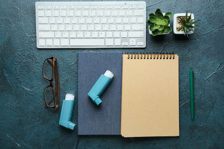 Asthma inhalers, eyeglasses, notebooks, houseplants and keyboard on dark background