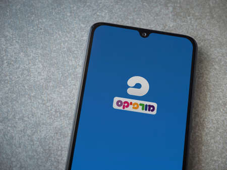 Lod, Israel - July 8, 2020: Morfix app launch screen with logo on the display of a black mobile smartphone on ceramic stone background. Top view flat lay with copy space.