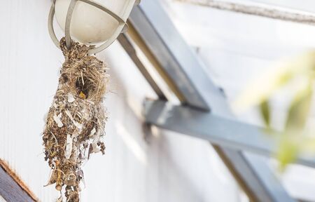 Baby Sunbird in the nest hanging on outdoor lamp of the house, outdoor day light, bird hungry waiting for food