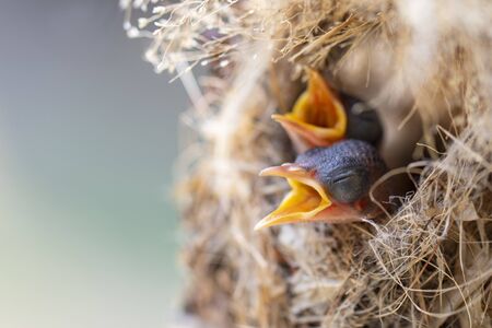 Closeup shot of young barn swallow chicks await feeding from their parents in the nest