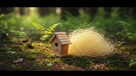 A panoramic, ultra-wide 16:9 photographic concept featuring a small, unpainted wooden birdhouse nest