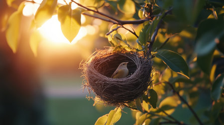 In the quiet solitude of a rustic barn loft, a single nest rests on old wooden planks, bathed in the warm, golden light of a new day. This image evokes a sense of hope, peaceful beginnings, and the promise of a safe and secure future.