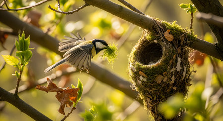 A small bird lands on its nest built in a tree fork, carrying a twig or dried grass in its beak. The image captures the industrious behavior of birds during the spring nesting season.