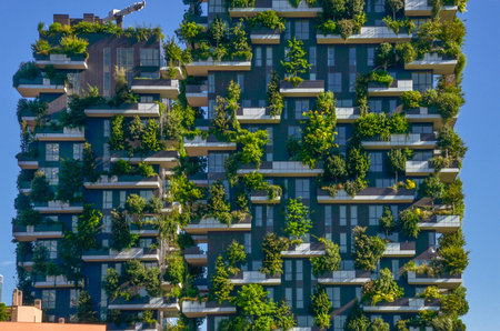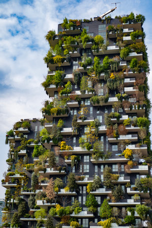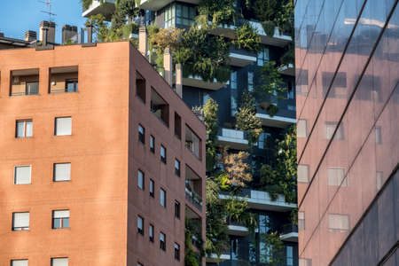 Green building with trees represents modern architecture in Milan. Vertical forest building. Bosco Verticale skyscraper. Sustainable architecture. Vertical forest tower in Italy.