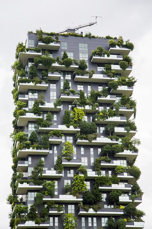 MILAN, ITALY - MAY 31, 2016: Detail of the Bosco Verticale in Milan, Italy. It is a pair of residential towers in the Porta Nuova district of Milan that host more than 900 trees.