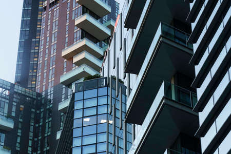Milan, Italy. Bosco Verticale, a close up view at the modern and ecological skyscrapers with many trees on each balcony. Modern architecture, vertical gardens, terraces with plants