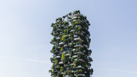 Residential tower, an example of modern architecture with various plants and tree-covered balconies. Sustainability and tree skyscraper concept.
