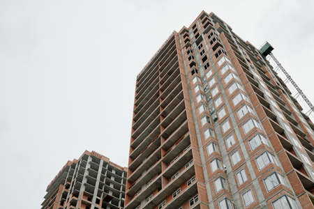 Below view of unfinished building of skyscraper or highrise condo forming block of flats against grey sky in the downtown of modern city