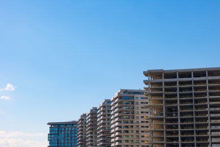 An unfinished construction with high-rise apartments. Economic crisis concept photo. Bankruptcy of contractor or mortgage crisis.